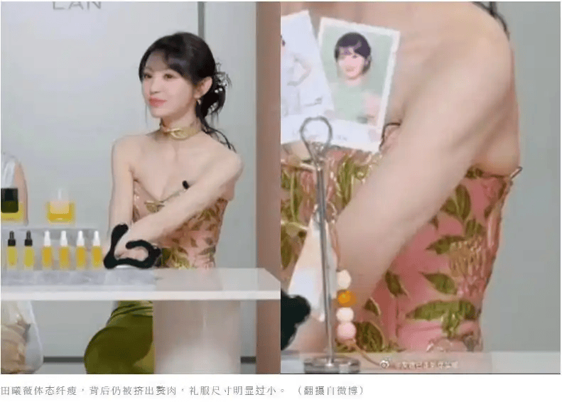 但这个事其实也不能怪田曦薇,因为当时团队准备的旗袍太小了是XS码,而田曦薇就算再瘦也是168的高妹,所以全程被勒得胸口紧绷、副乳挤出、后背全是褶皱,全程频繁拉扯调整。