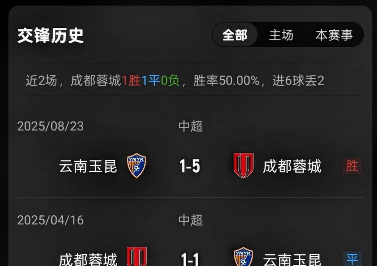 从历史交锋记录来看,两队都是近年来才升入中超联赛的球队,因此仅在2025赛季有过2次交锋。 成都蓉城取得了1胜1平的战绩,占据了一定的心理优势。 最令人印象深刻的是上赛季成都蓉城客场5-1大胜云南玉昆的比赛,那场比赛中成都蓉城的进攻完全压制了对手。